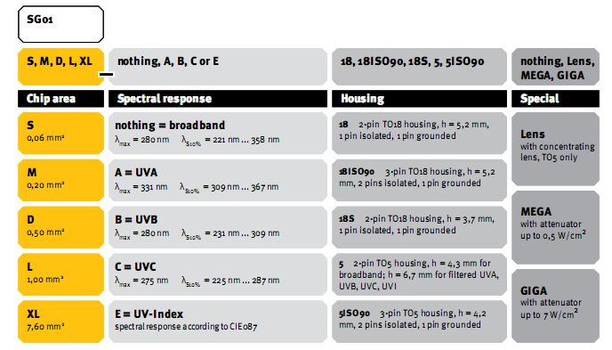 SiC photodiodes are available with seven different active chip areas from 0.06 mm2 up to 36 mm2 Standard version is broadband UVA-UVB-UVC. Four fltered versions lead to a tighter sensitivity range. All photodiodes have a hermetically sealed metal housing (TO type), either a 5.5 mm diameter TO18 housing or a 9.2 mm TO5 housing. Further option is either a 2 pin header (1 isolated, 1 grounded) or a 3 pin header (2 isolated, 1 grounded).