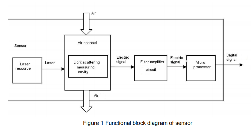 Laser scattering principle is used for such sensor, i.e. produce scattering by using laser to radiate suspending particles in the air, then collect scattering light in a certain degree, and finally obtain the curve of scattering light change with time. In the end, equivalent particle diameter and the number of particles with different diameter per unit volume can be calculated by microprocessor based on MIE theory. Please find the functional diagram of each part of sensor from Figure 1 as follows.
