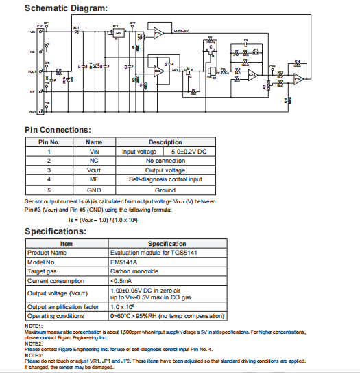 *2 The main function of this module is to simply convert sensor output current into voltage output without temperature compensation. For more information on a temperature compensation circuit, refer to Application Notes for TGS5xxx or contact Figaro.