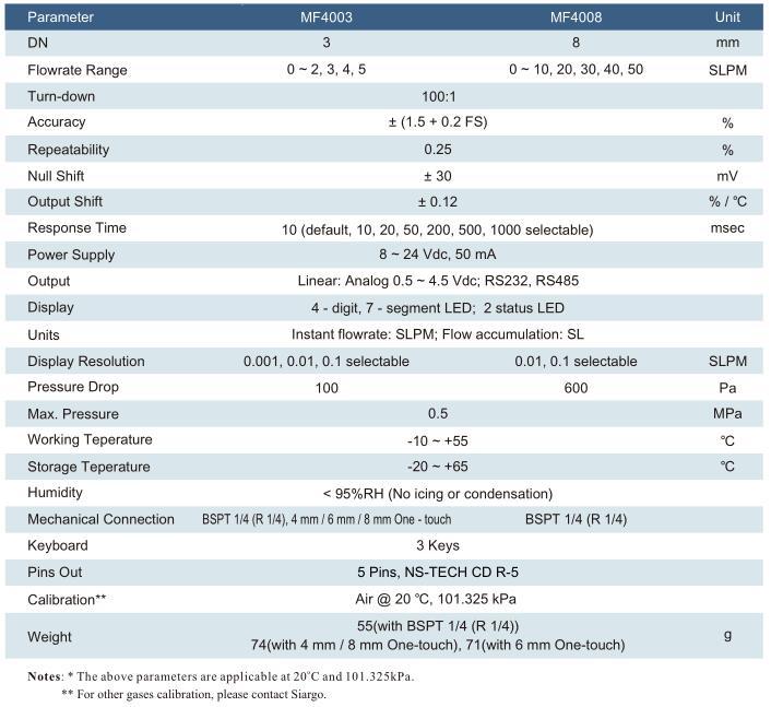 - MF4003: 0 ~ 2, 3, 4, 5 SLPM