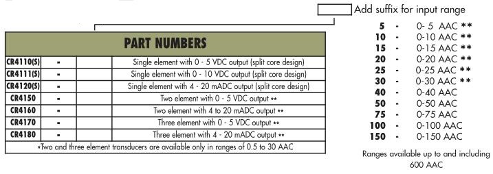 CR4150 True RMS AC Current Transducer PART NUMBERS
